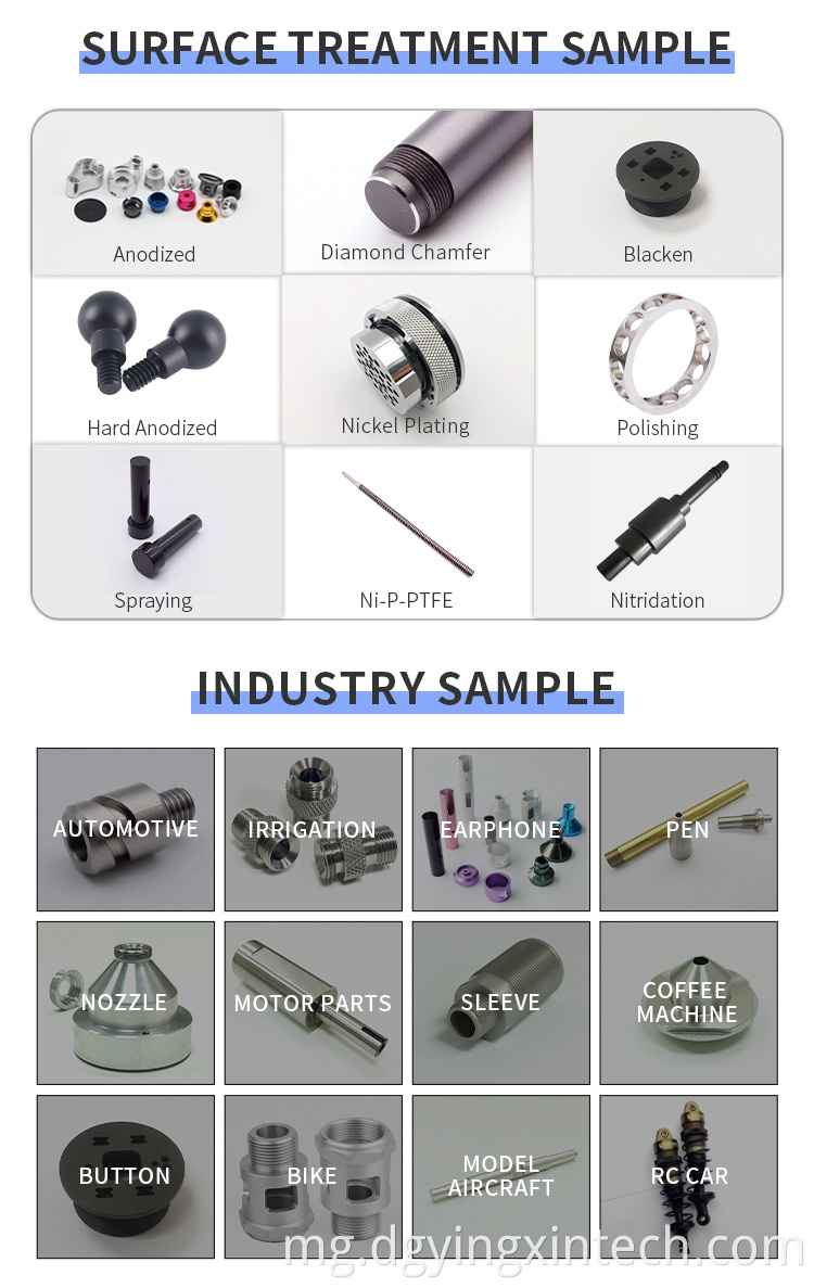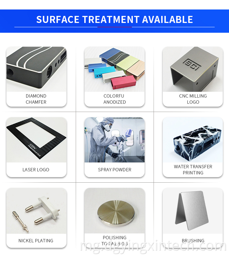 Blacking, polishing, anodize, PVD, spraying, chrome plating, zinc plating, nickel plating, tinting, etc